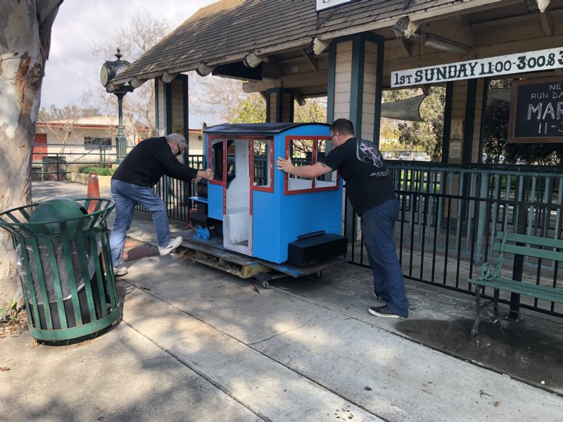Dale and Jen’s rolling the mall train into place. We had to unbolt a section of fence and lower it on to dolly’s with the tractor. |